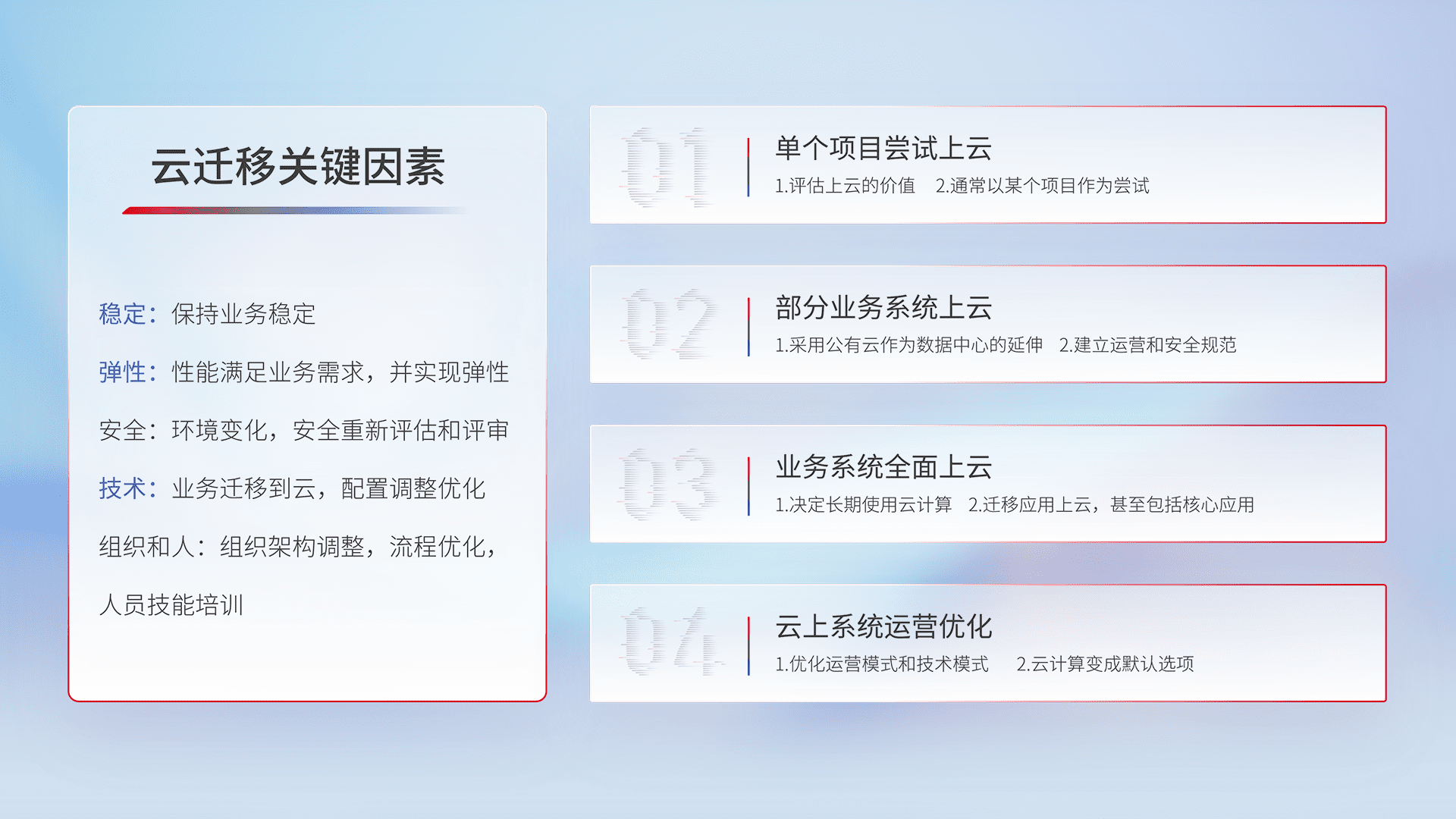结合实际业务,,,,从规划设计、、、云平台选型、、、云原生改造、、、、数据迁移、、、集成交付,,,,迁移全过程为客户识别最佳上云路径,,,做好风险识别管理,,设计网络架构、、、、身份权限、、安全审计合规、、操作审计、、、、日志审计、、、监控告警策略、、、、多站点容灾设计等,,,,对云上基础设施进行整体规划,,提升IT治理水平,,,以满足弹性、、、高可用、、、、高性能的需求。。。