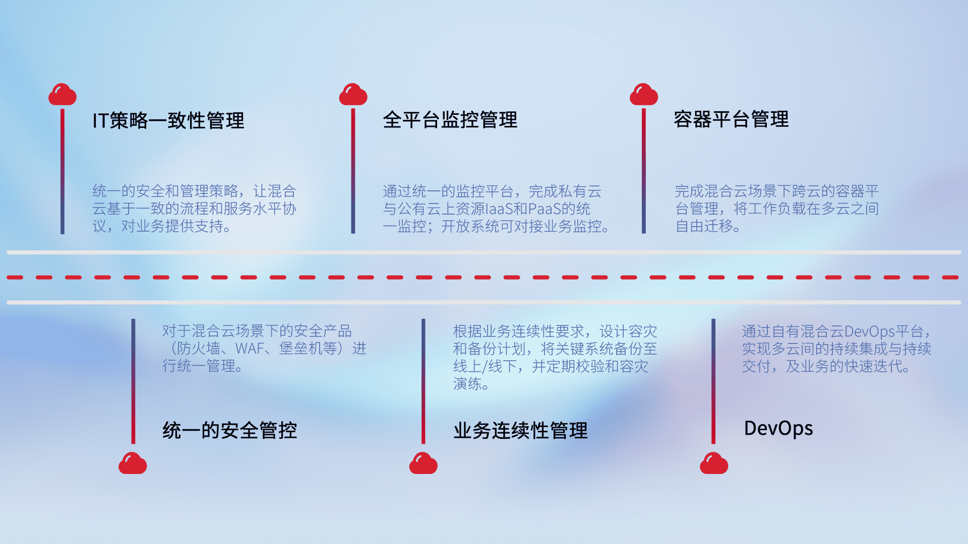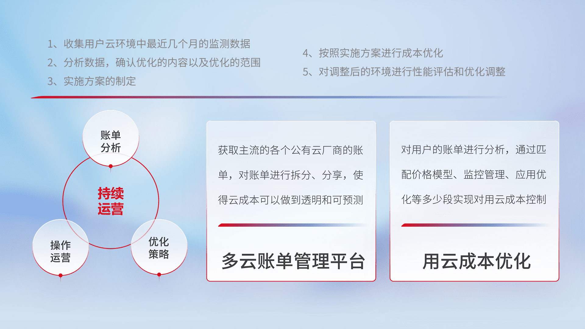 通过多云纳管,,以统一的资源数据模型把客户的云资源进行抽象和封装,,,,进而实现对多云资源的统一操作,,,保障云资源管理的可靠性、、、稳定性与可用性。。。量身定制化运维内容,,配置、、开发运维、、、、补丁管理、、、备份、、监控、、、、认证和访问管理、、审计和日常巡检等,,,,保障在用云过程中的可靠度,,,,稳定度以及高可用率。。。。