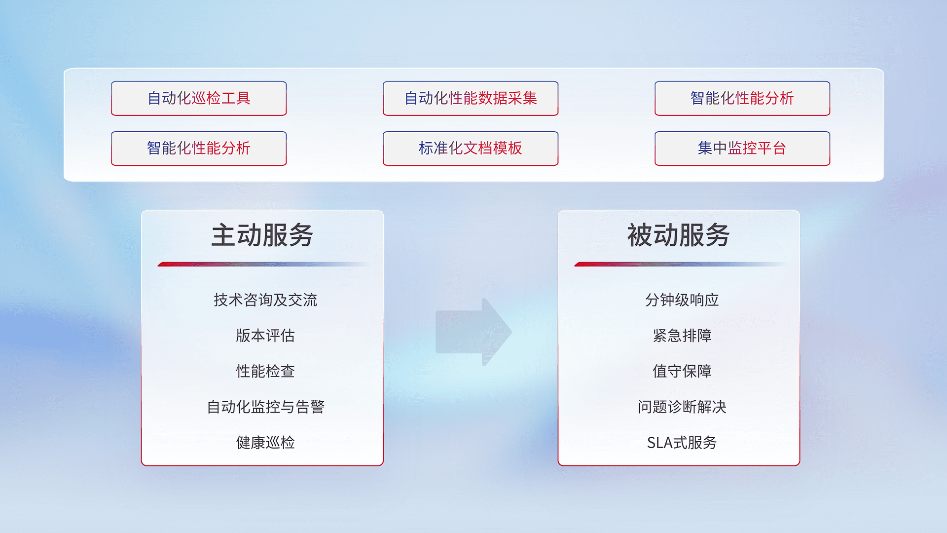 智能化工具和标准化文档,,,保障服务质量,,提供主动服务(包含技术咨询、、、、版本评估、、、、性能检查、、、、自动化监控与告警、、、、健康巡检)和被动服务包含(分钟级响应、、紧急排障、、、值守保障、、问题诊断解决、、、SLA服务)。。。。